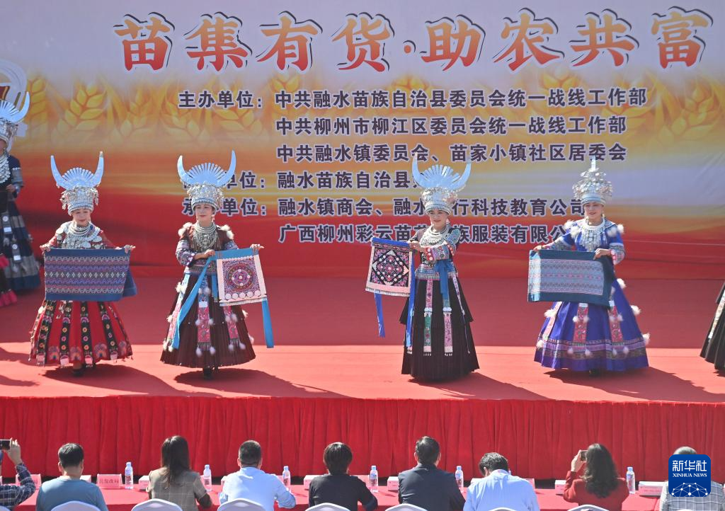 當日,廣西融水苗族自治縣融水鎮(zhèn)苗家小鎮(zhèn)社區(qū)舉辦第二屆“苗集有貨·助農(nóng)共富”助農(nóng)大集市,集市設(shè)立特色農(nóng)產(chǎn)品區(qū)、手工藝品區(qū)、民族特色美食區(qū)、非遺技藝展示區(qū)等,對各鄉(xiāng)鎮(zhèn)的農(nóng)特產(chǎn)品和非遺文化進行展示、展銷,促進鄉(xiāng)村振興產(chǎn)業(yè)發(fā)展。