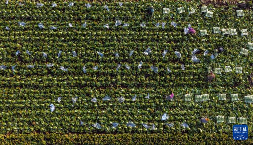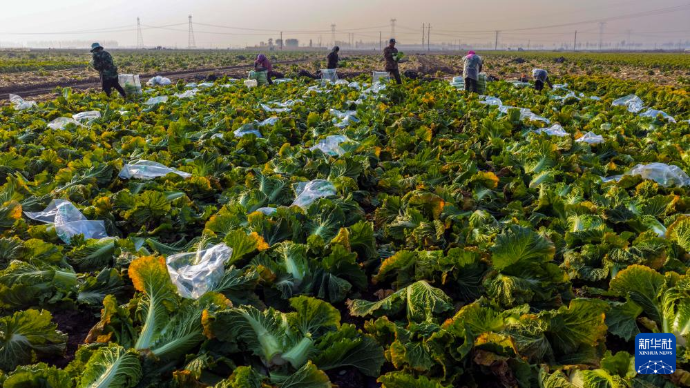 為應(yīng)對寒潮天氣,河北省唐山市玉田縣農(nóng)民加緊田間大白菜的搶收、外運和防寒工作,保障冬季蔬菜供應(yīng)。
