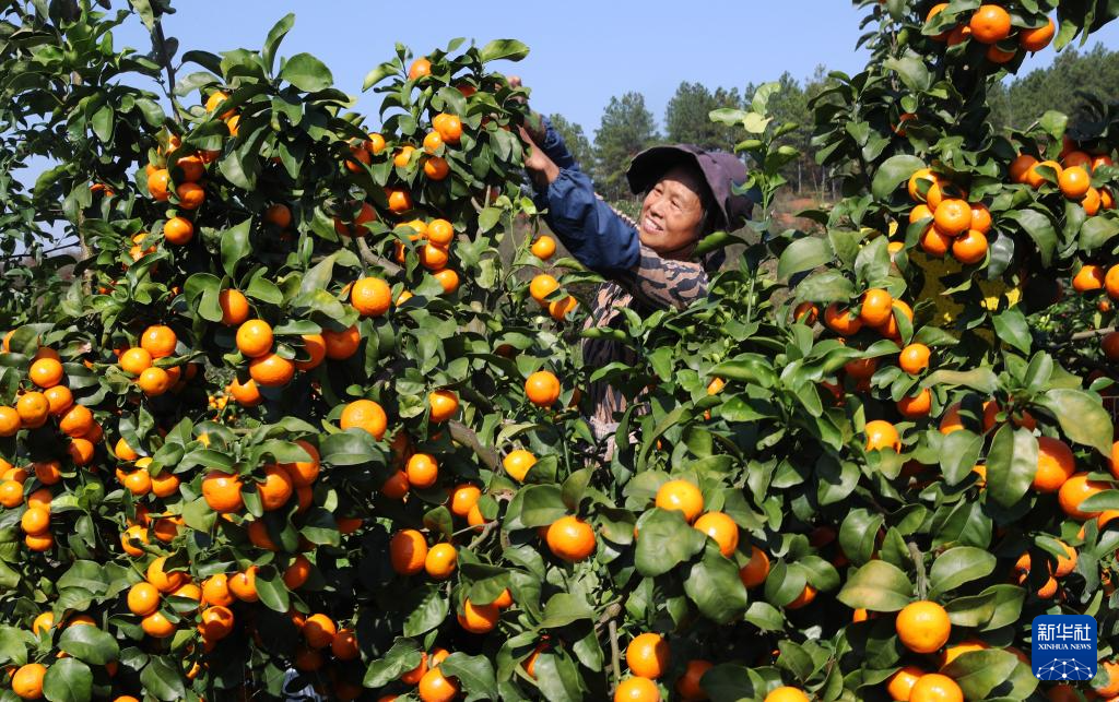 11月15日,在位于湖南省衡陽市衡南縣花橋鎮(zhèn)的源氏農(nóng)林柑橘種植基地,務工人員采摘砂糖橘。