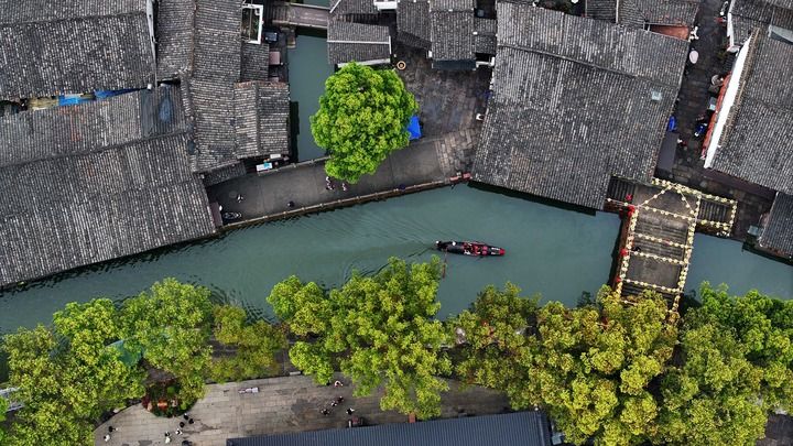 烏篷船行駛在安昌古鎮(zhèn)的河道上。新華社記者 王迎 攝