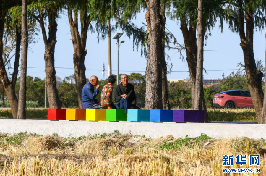 2025年10月25日,岱山縣高亭鎮(zhèn)石馬岙村村民坐在新落成的景觀休閑椅上話家常。 新華網(wǎng)發(fā) 汪菁璐攝