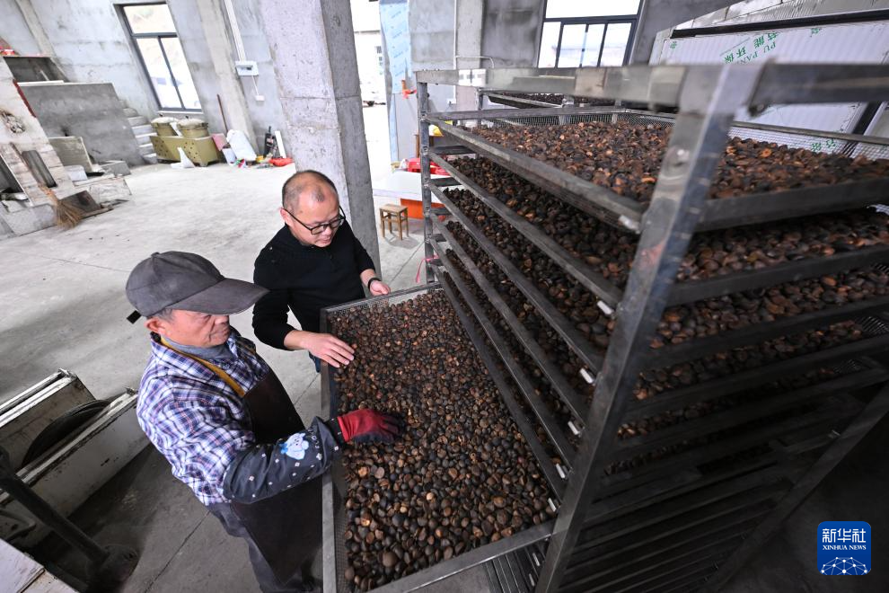 11月18日,在福州市永泰縣同安鎮(zhèn)連山村一公司車間內(nèi),工作人員在查看烘干的油茶粒。