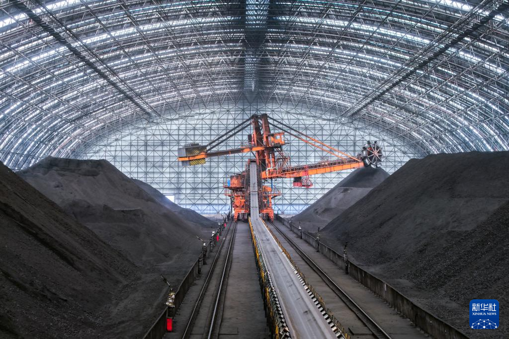 這是11月19日拍攝的甘肅電投常樂電廠煤棚內(nèi)堆存的燃煤(無人機照片)。