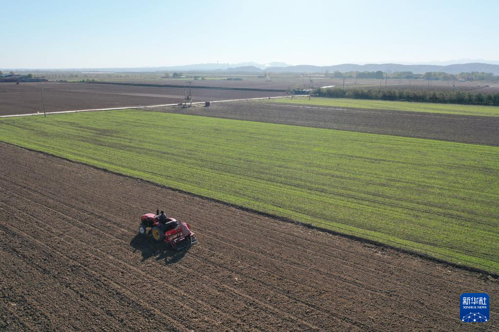 11月19日,河南省沁陽市王曲鄉(xiāng)古章村農(nóng)民駕駛農(nóng)機播種小麥(無人機照片)。