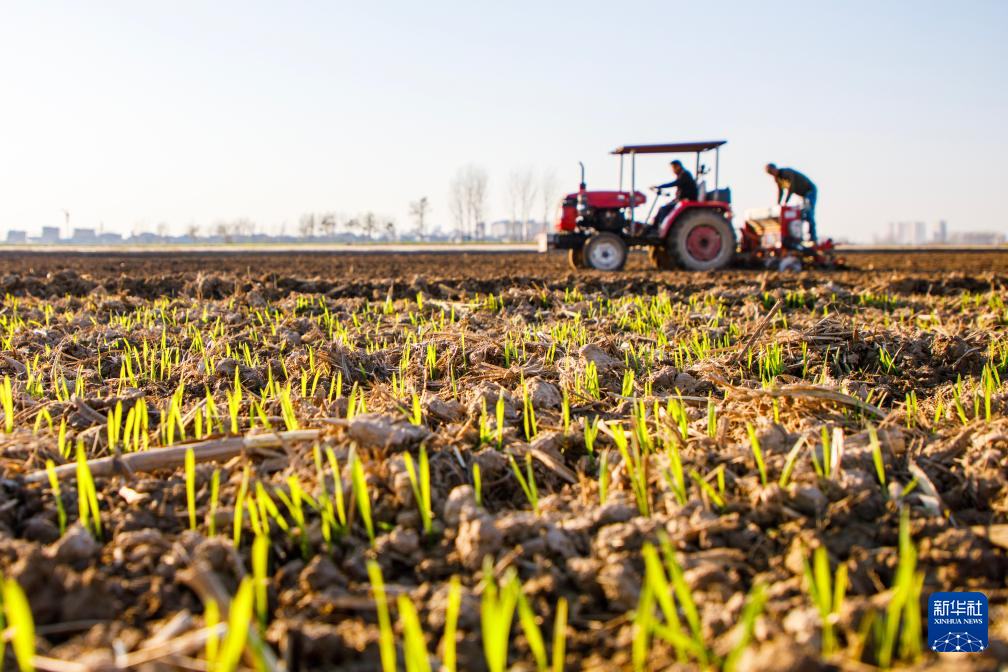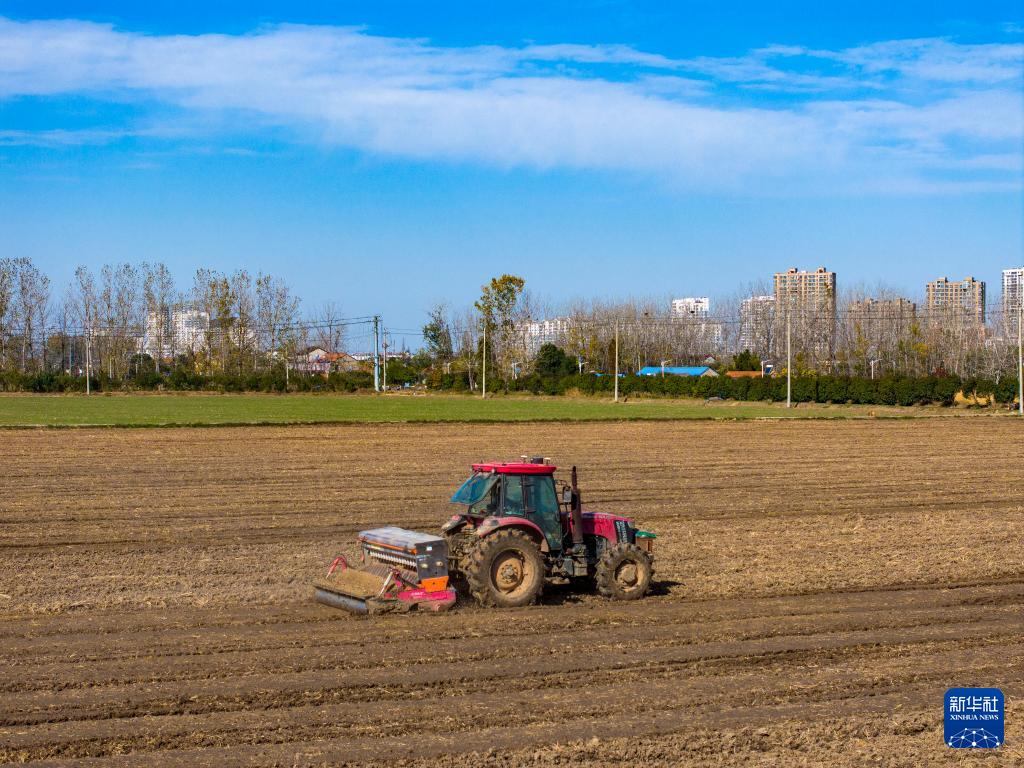 11月19日,在江蘇省常州市金壇區(qū)金城鎮(zhèn),農(nóng)機在田里播種小麥。