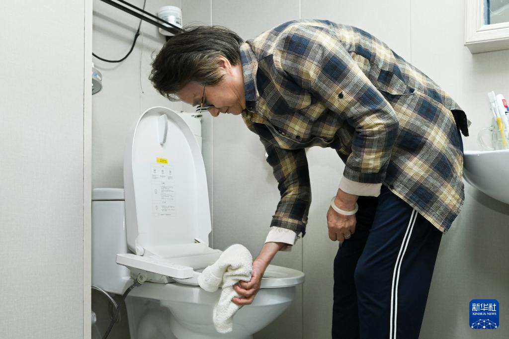 10月29日,上海市楊浦區(qū)定海路街道居民陳燕芬擦拭抽水馬桶。