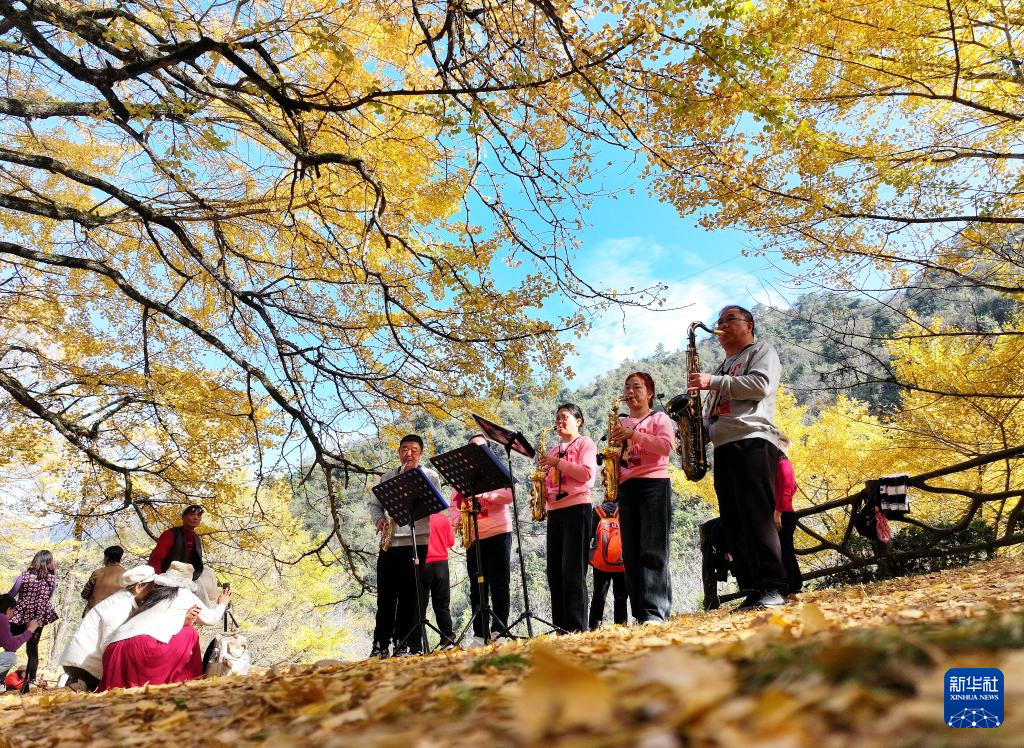 11月23日,薩克斯愛好者在桐子坳村銀杏樹下為游客表演。
